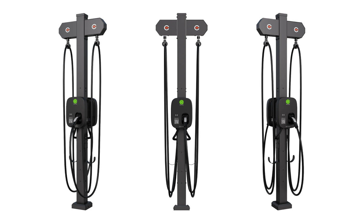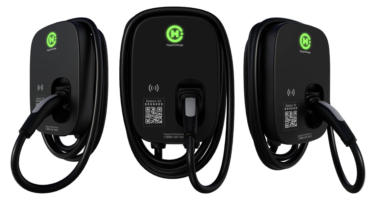 Features of the Hypercharge Halo include an LED indicator, IK08 & IP65 protections, RFID reader, pre-installed station ID & QR code, SAE J1772 or NACS charging plug, and 18ft charging cable.